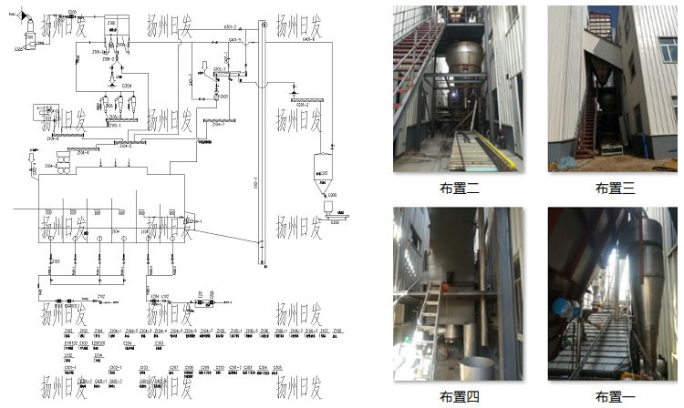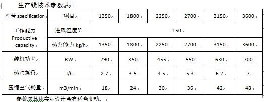 (3)具体生产线参数,需要根据具体物料、产量进行针对性的设计以进风150℃,原料水份为10%,成品水份0.5%举例,4吨生产线,约装机功率180KW、蒸汽用量750kg/h,冰水、压缩空气根据配套的辅机确定。