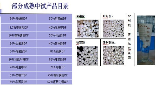 The size of the pressure sprayed product can not be enlarged because the average size is only 80-150 mesh, and the hollow egg shell shape causes a major drawback: the longer the water entry time is, the longer the wetting time is, even longer than the 3 minutes required by the national standard. In the extreme state, there is a small cluster particle "tug" phenomenon, which is worse than that of the WG preparation, although the single particle is qualified. However, the overall wetting time is unqualified, especially after particle breakage.润湿时间、状态:甲维盐约在4分钟之后,水面的“团”才能完全崩解;嘧菌酯约在3分钟之后,水面的“团”才能完全崩解;拿敌稳约在2-3小时之后,水面的“团”才能完全崩解,极端状态始终有残留。